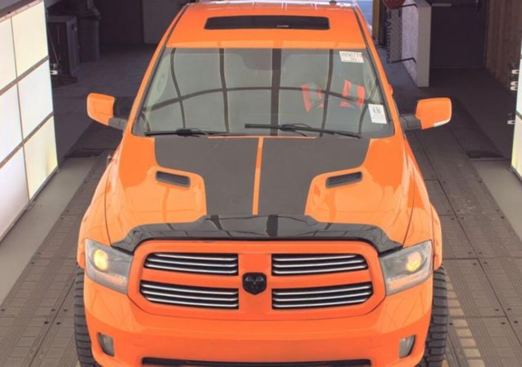 Bold styling and aggressive performance define this 2015 Ram 1500 Sport Crew Cab 4x4, finished in eye-catching Ignition Orange and powered by the legendary 5.7L HEMI V8. Equipped with a lift, aftermarket wheels and tires, and an aftermarket exhaust, this truck delivers a commanding stance, enhanced off-road presence, and a deep, aggressive sound to match its performance.