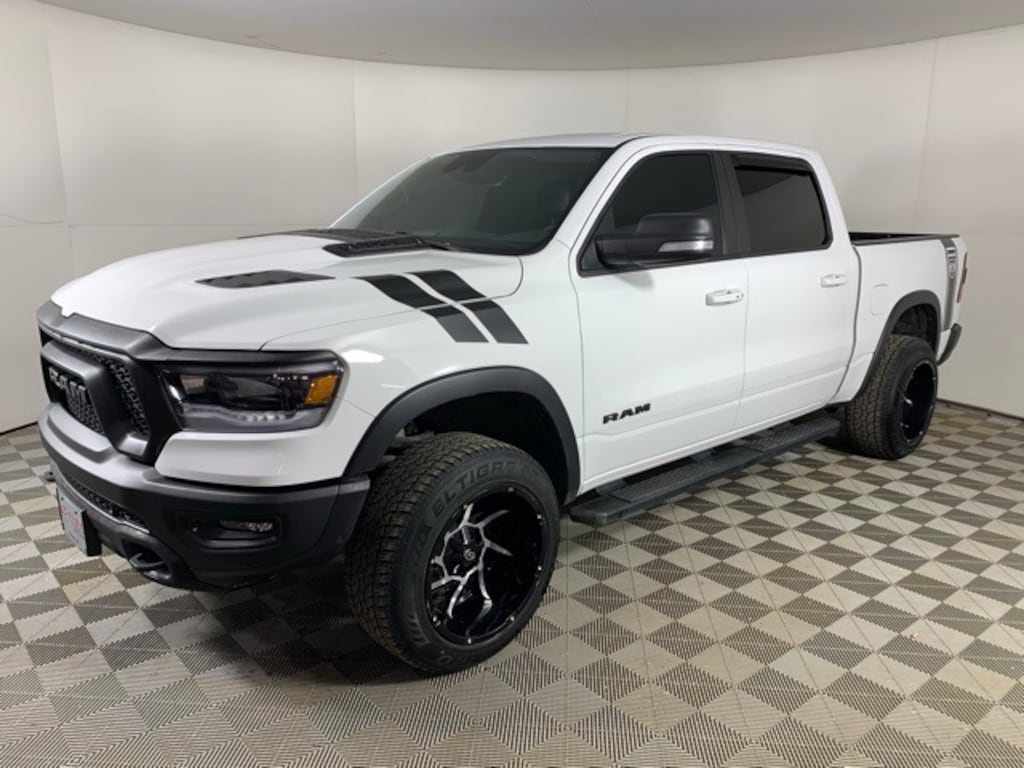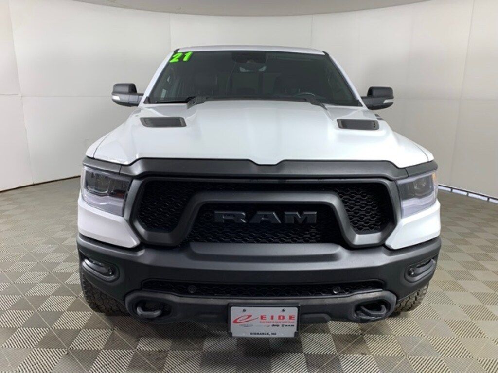 Experience unmatched strength and bold style in the 2021 Ram 1500 Rebel Crew Cab powered by the legendary HEMI 5.7L V8 engine with Multi Displacement VVT and advanced 4WD. This one owner truck in bright white with an accident free Auto Check and trade in history delivers both confidence and rugged capability. The Ram 1500 continues to be recognized with best in class awards for ride quality luxury interior and towing capacity making it a top contender among full size trucks. Step inside and enjoy black leather trimmed bucket seats with cloth accents heated front and second row seating a heated steering wheel dual zone climate control and a Uconnect 8.4 inch touchscreen with Apple CarPlay Android Auto Bluetooth and wireless charging. Convenience features include remote start keyless push button entry power liftgate and underseat storage. Safety comes standard with a rear view camera reverse sensing system trailer hitch and rain sensing windshield wipers. With Night Edition styling and aggressive Rebel design this 2021 Ram 1500 combines award winning performance comfort and toughness in one impressive package.