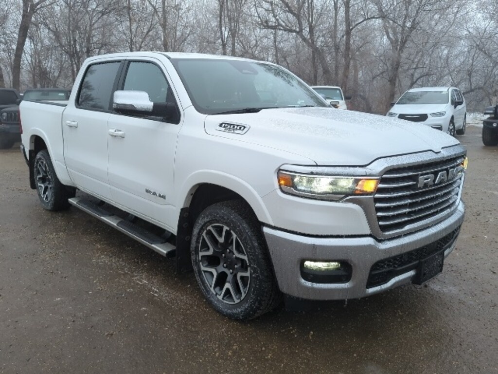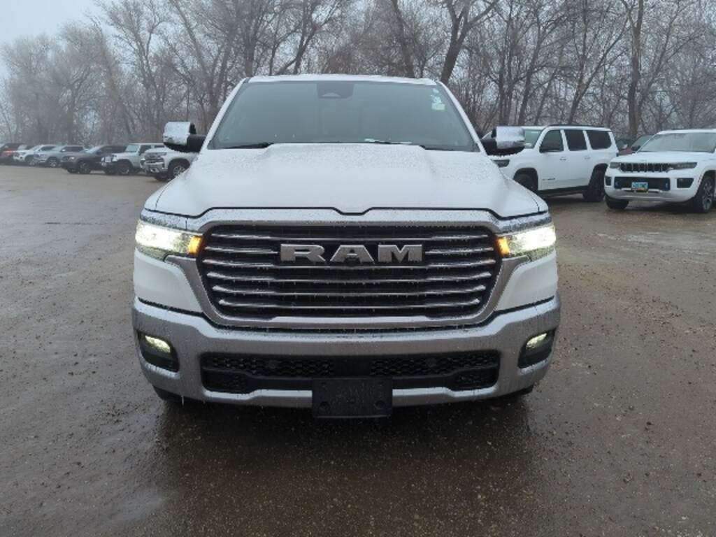 Command the road in this 2025 Ram 1500 Laramie, a 1-owner, accident-free truck that pairs rugged capability with premium comfort. Powered by a 3.0L I6 engine and 4WD, it delivers smooth, confident performance whether towing with its trailer hitch or navigating city streets. The Ivory White Tri-Coat Pearlcoat exterior complements the black leather-trimmed bucket seats inside, offering a refined, stylish cabin. Enjoy modern technology and convenience with Navigation/GPS, Apple CarPlay/Android Auto, Bluetooth hands-free phone, SiriusXM Satellite Radio, and a 33-gallon fuel tank for extended drives. Comfort features include heated and cooled front seats, heated second-row seats, a heated steering wheel, dual-zone automatic climate control, and a garage door transmitter. Safety and driver-assist features like Blind Spot Alert, CrossPath Detection, ParkSense front and rear park assist, Active Lane-Management System, auto high-beam headlights, and rain-sensitive windshield wipers provide confidence on every journey. Remote start, fully automatic headlights, and the Laramie Level 1 Equipment Group complete this well-equipped, capable, and stylish pickup truck thats ready for work or adventure.